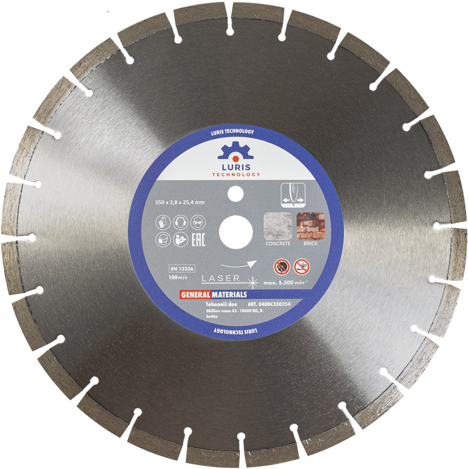 Dijamantska ploča prečnika 350 mm marke Luris namenjena je za precizno i brzo sečenje debelih betonskih površina, armiranog betona i drugih građevinskih materijala. Idealna za velike građevinske projekte i industrijsku upotrebu.